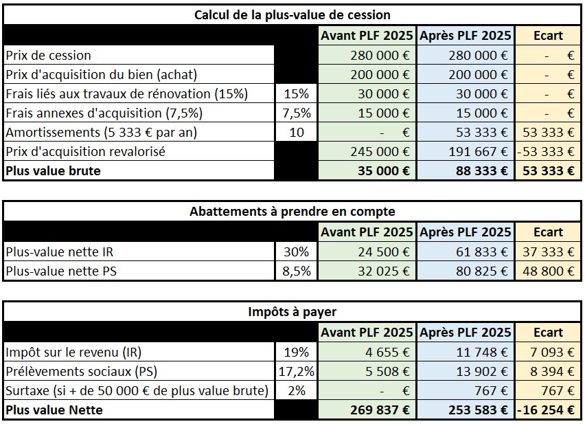 À compter du 15 février 2025, les amortissements sont réintégrés dans le calcul de la plus-value. Autrement dit, les sommes déduites au fil des années en tant qu’amortissements viennent réduire le prix d’achat du bien, augmentant ainsi le montant de la plus-value imposable.